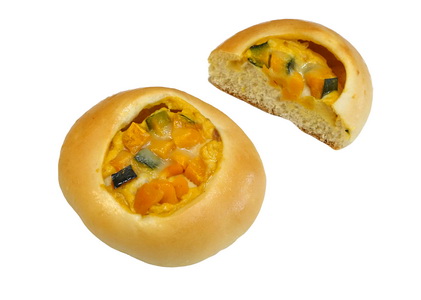かぼちゃ入りのグラタンフィリングを包み角切りかぼちゃをのせて焼きあげました。