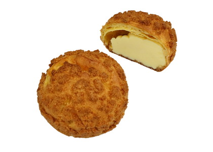 クッキー生地をのせて焼きあげたシュー生地に口溶けのよいカスタードホイップを注入しました。